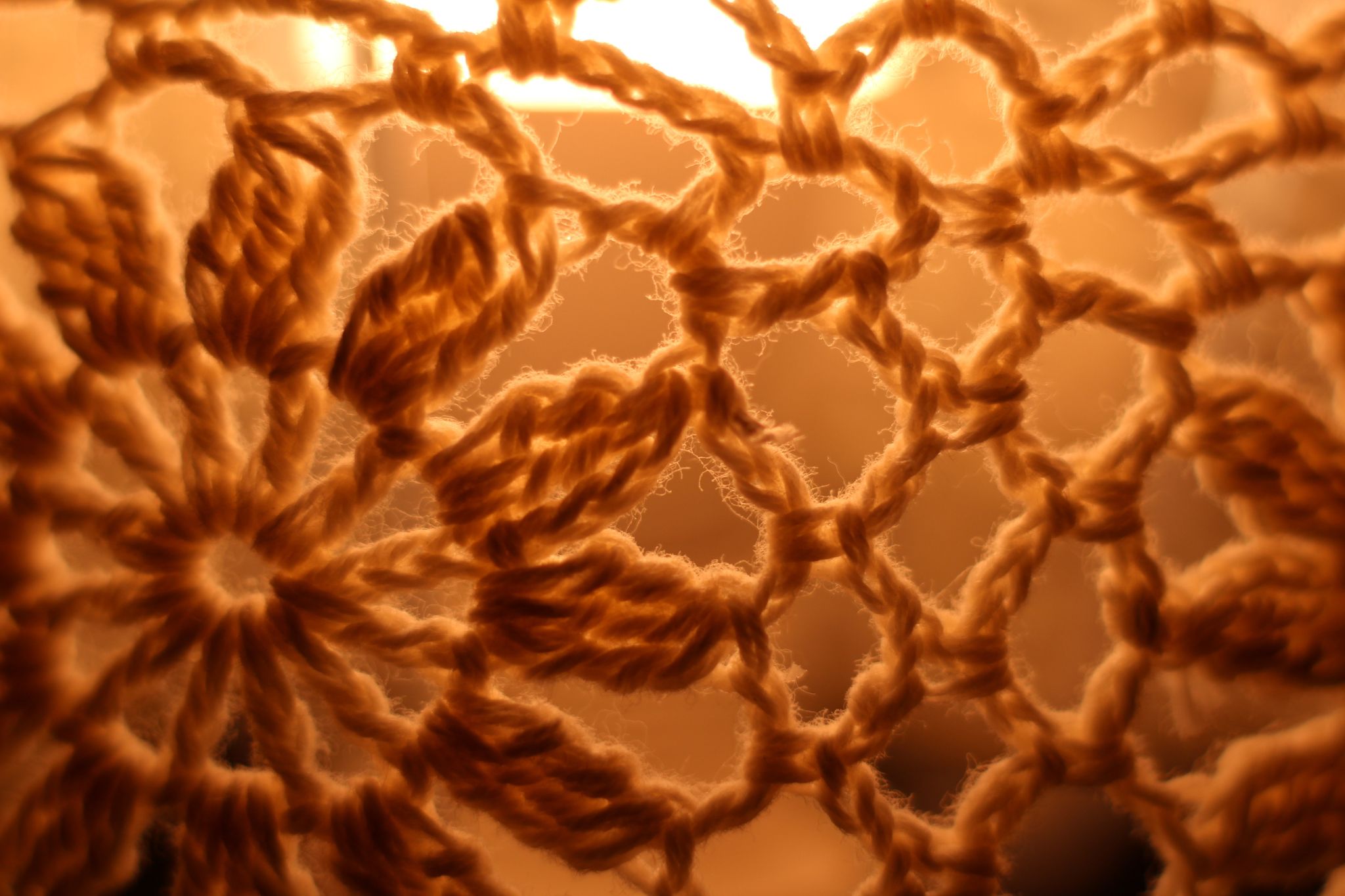 Abstrakte Makrofotografie eines dunklen Textilgewebes vor gelben Licht; künstlerische Detailaufnahme von Häkelstrukturen und feinen Fasern.