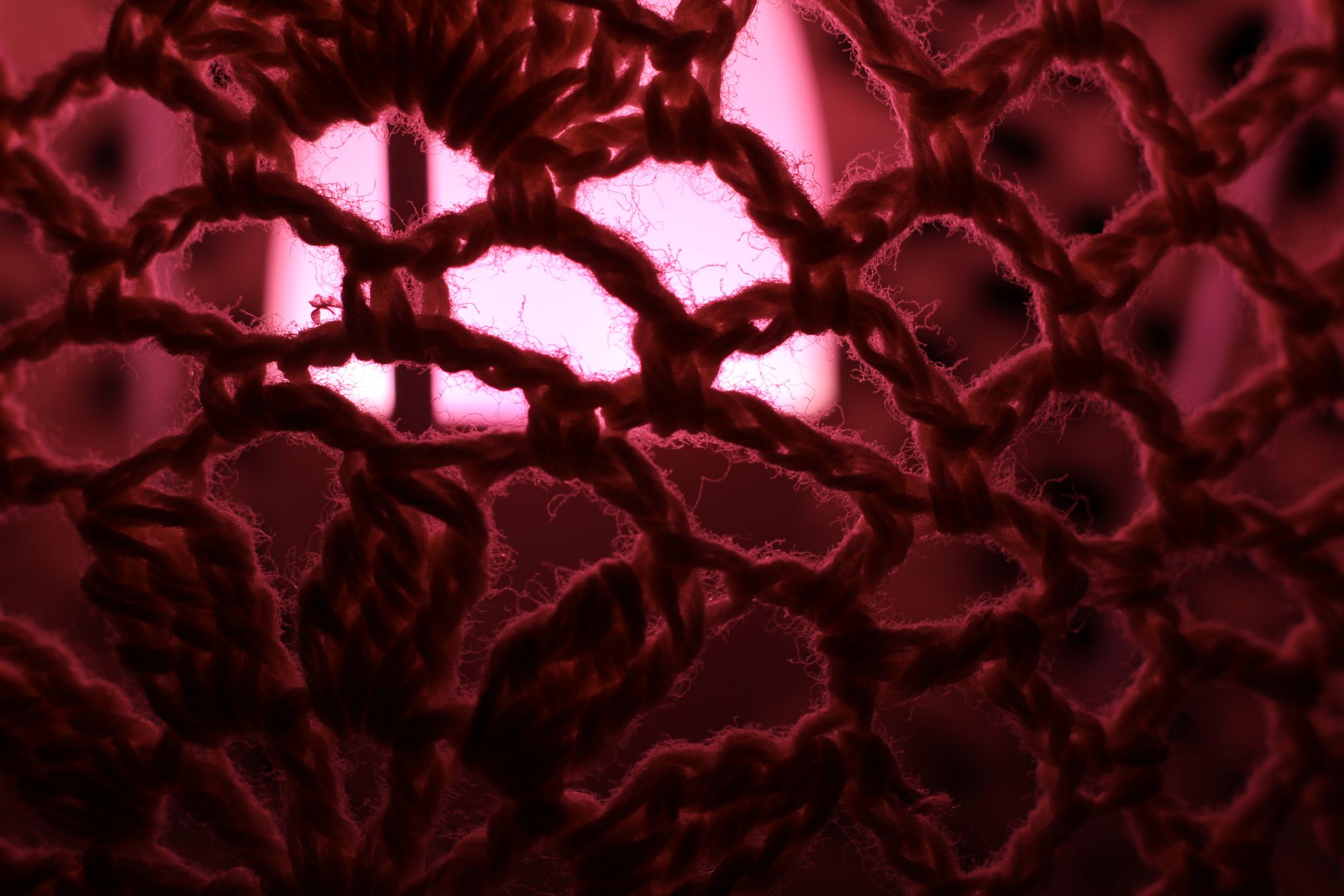 Abstrakte Makrofotografie eines dunklen Textilgewebes vor magentafarbenem Licht; künstlerische Detailaufnahme von Häkelstrukturen und feinen Fasern.