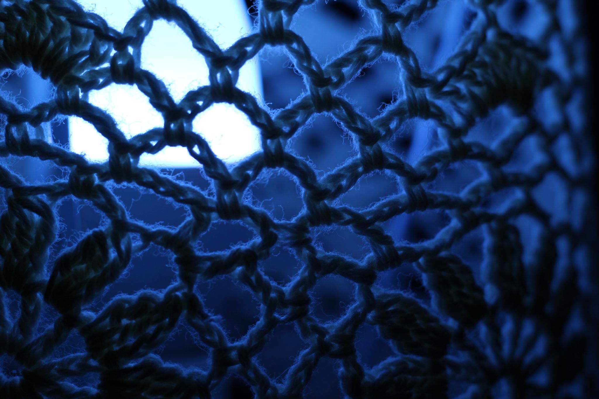 Abstrakte Makrofotografie eines dunklen Textilgewebes in tiefblauem Licht; künstlerische Detailaufnahme von Maschenstrukturen und Garnfasern vor leuchtend blauer Lichtquelle.