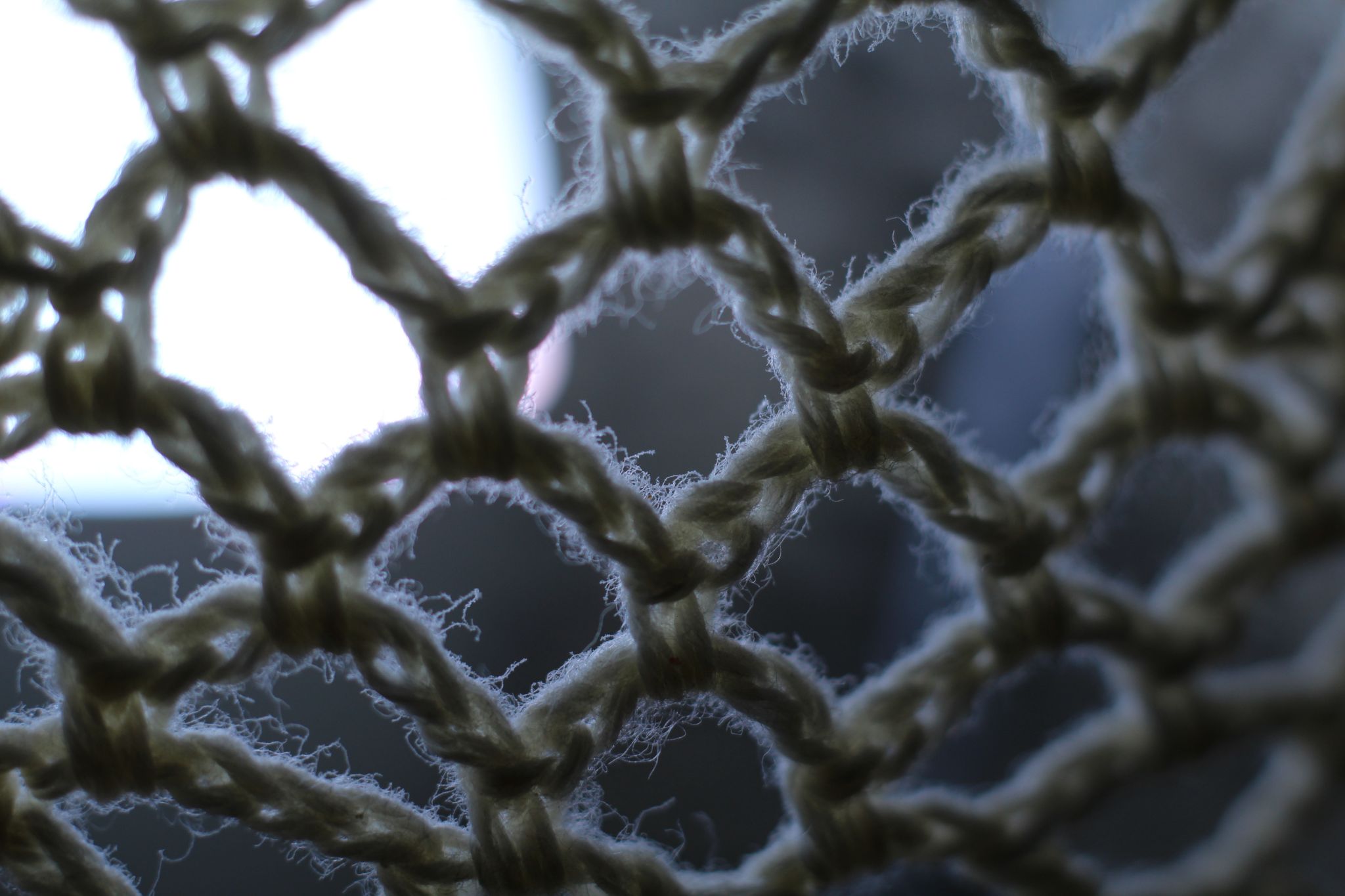 Abstrakte Makrofotografie eines hellen Textilgeflechts vor kühlem Tageslicht; künstlerische Detailaufnahme von groben Garnstrukturen und Fasern mit sanftem Bokeh.