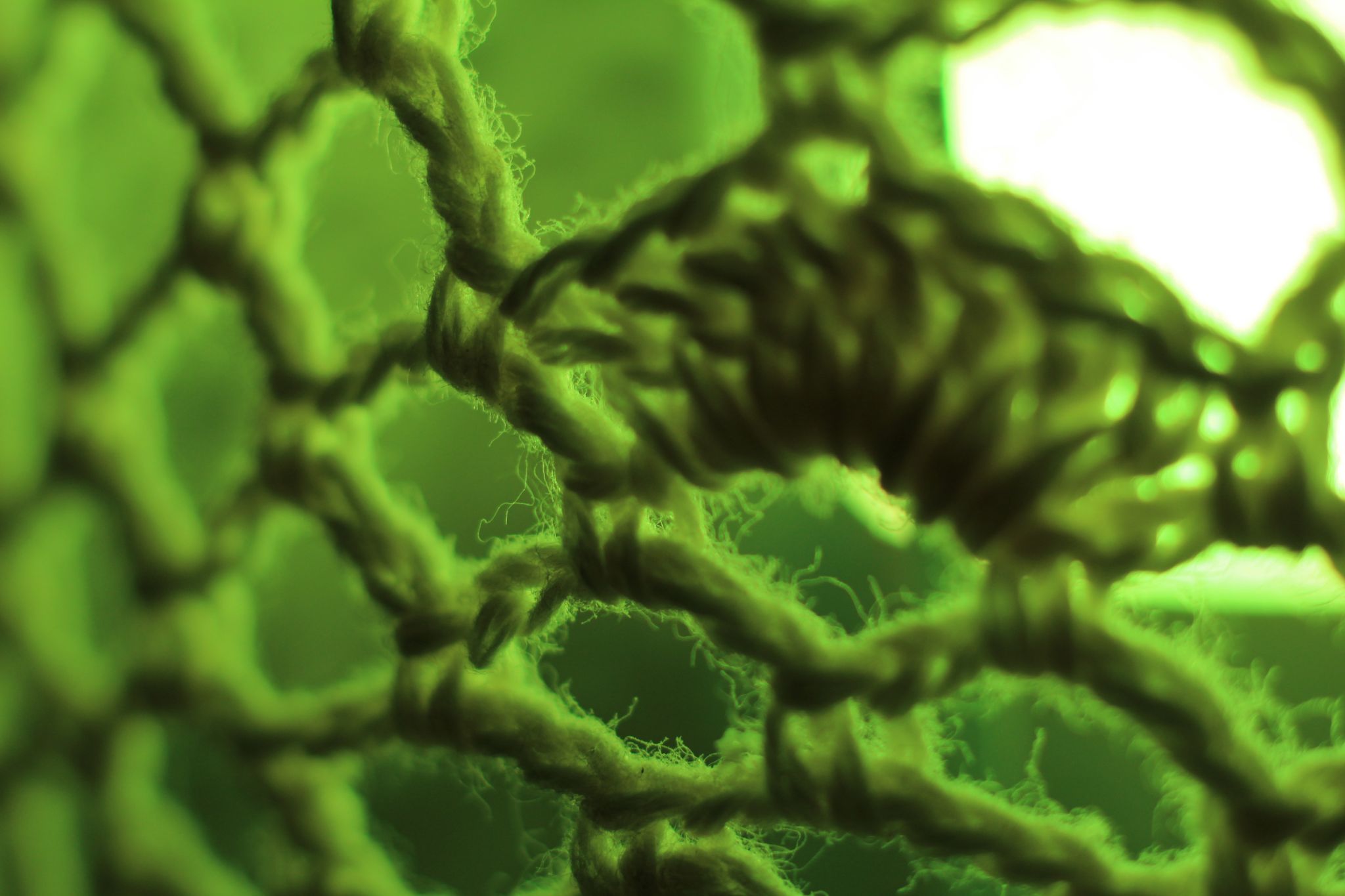 Abstrakte Makrofotografie eines Textilgeflechts in leuchtend grünem Licht; künstlerische Detailaufnahme von groben Garnschlingen und Fasern vor heller Lichtquelle.