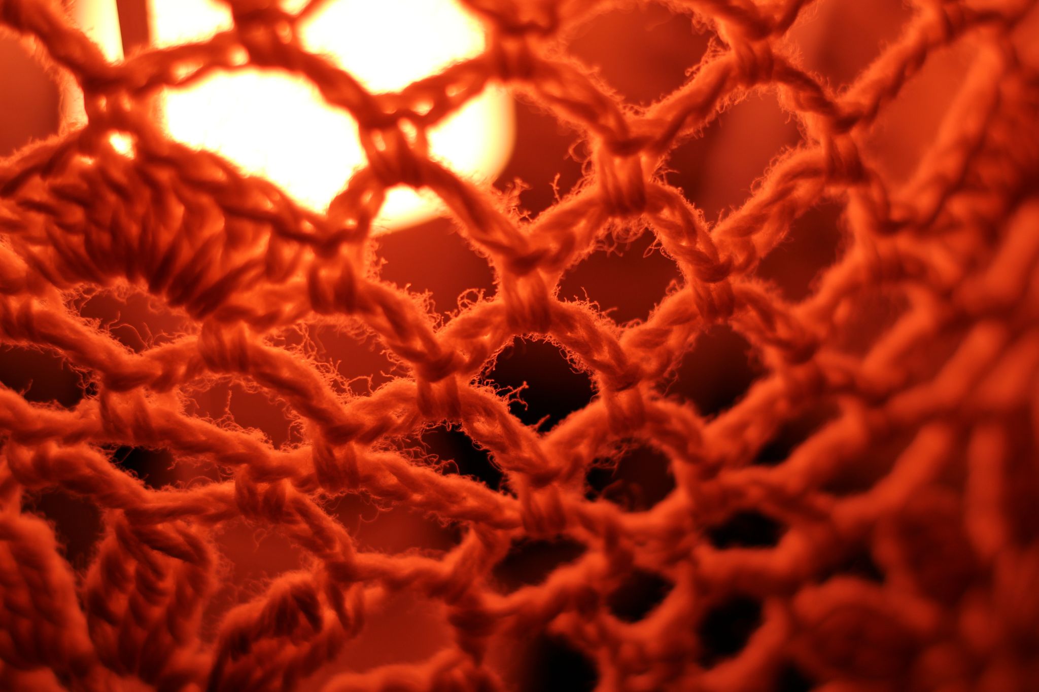 Abstrakte Makrofotografie eines Textilgeflechts in intensivem, glühendem Orange; künstlerische Detailaufnahme von Maschenstrukturen und feinen Garnfasern vor einer hellen Lichtquelle.